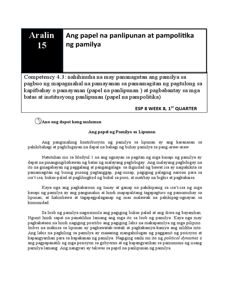 Aralin 4 Ang Papel Na Panlipunan At Pampolitikal Ng Pamilya
