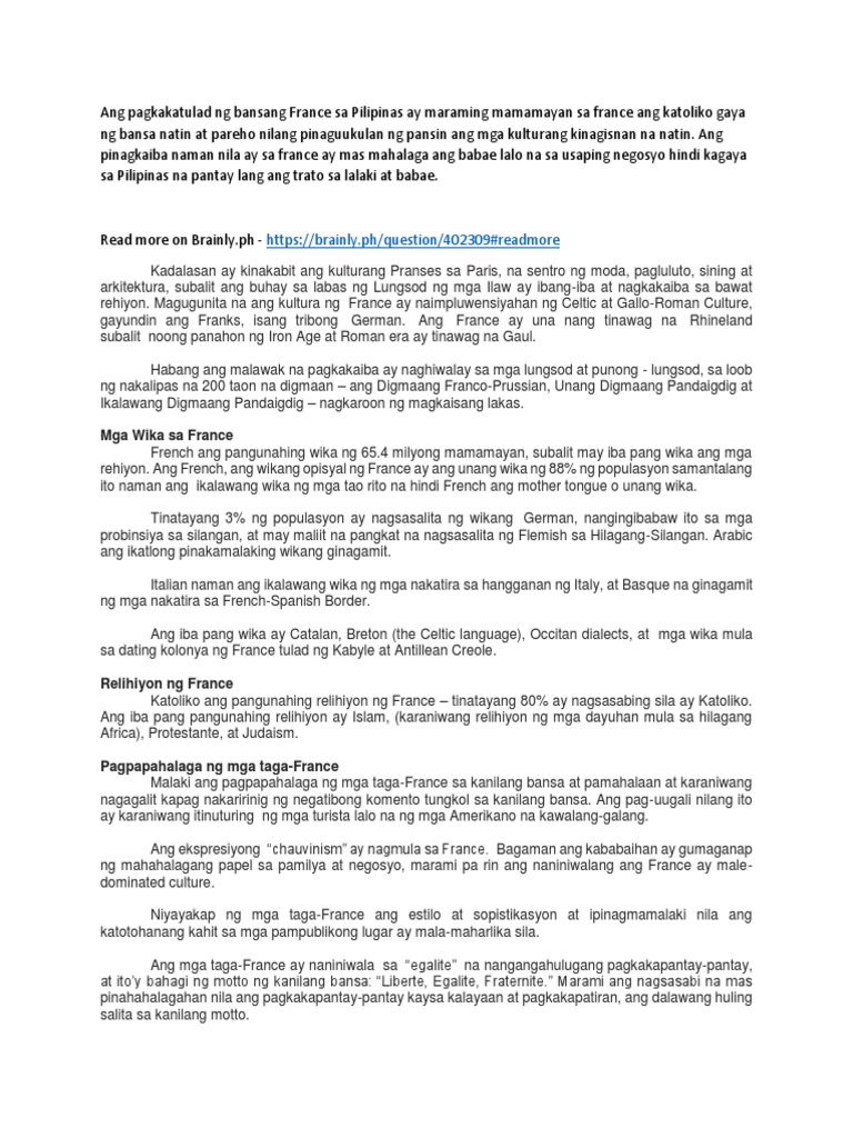 Ang Pagkakatulad Ng Bansang France Sa Pilipinas Ay Maraming Mamamayan Sa France Ang Katoliko Gaya Ng Bansa Natin At Pareho Nilang Pinaguukulan Ng Pansin Ang Mga Kulturang Kinagisnan Na Natin
