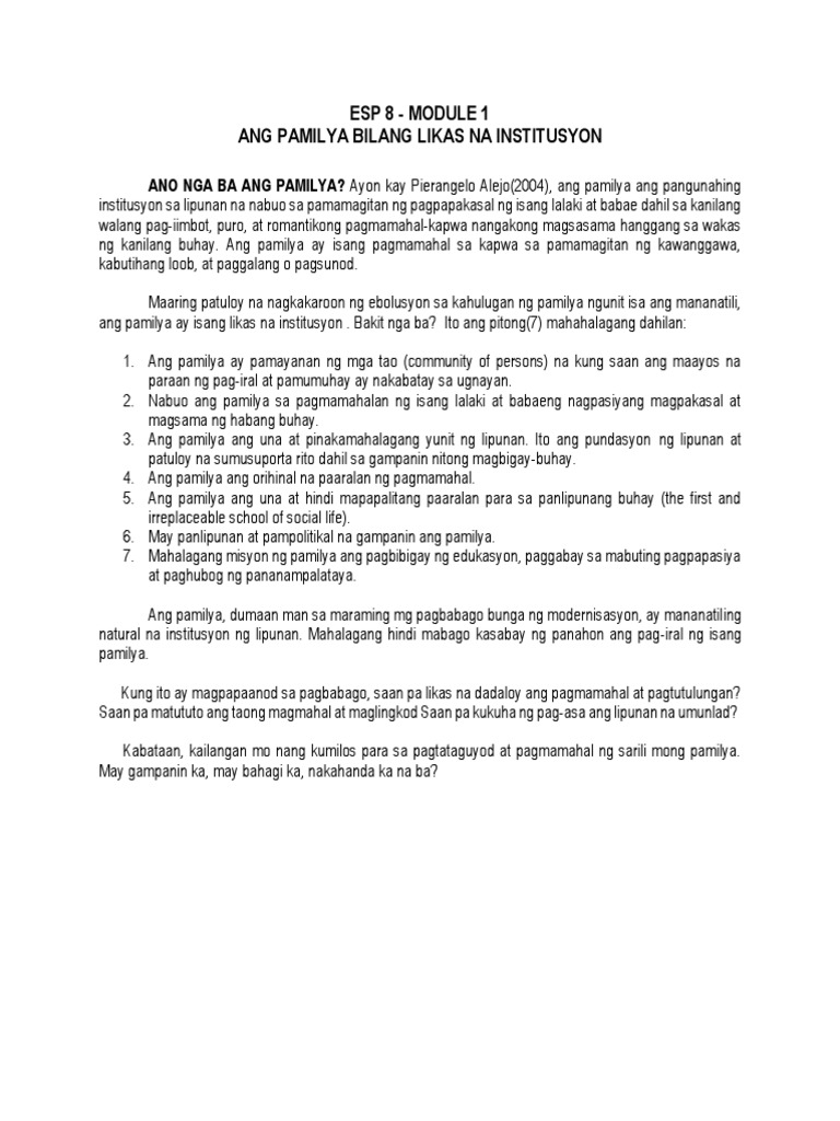 Doc Esp 8 Yunit 1 Modyul 1 Ang Pamilya Bilang Natural Na Institusyon Buod Ligaya Delgado Academia Edu